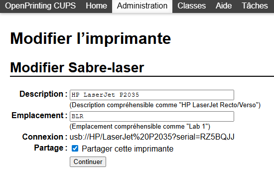Remplir les infos. Moi j’ai configuré un enregistrement DNS donc je peux mettre : https://print.homelab.emiletouron.fr:631/printers/Sabre-laser. « Et voilà », comme disent les Anglais. Evidemment on va éviter d’exposer le port 631 sur Internet.
