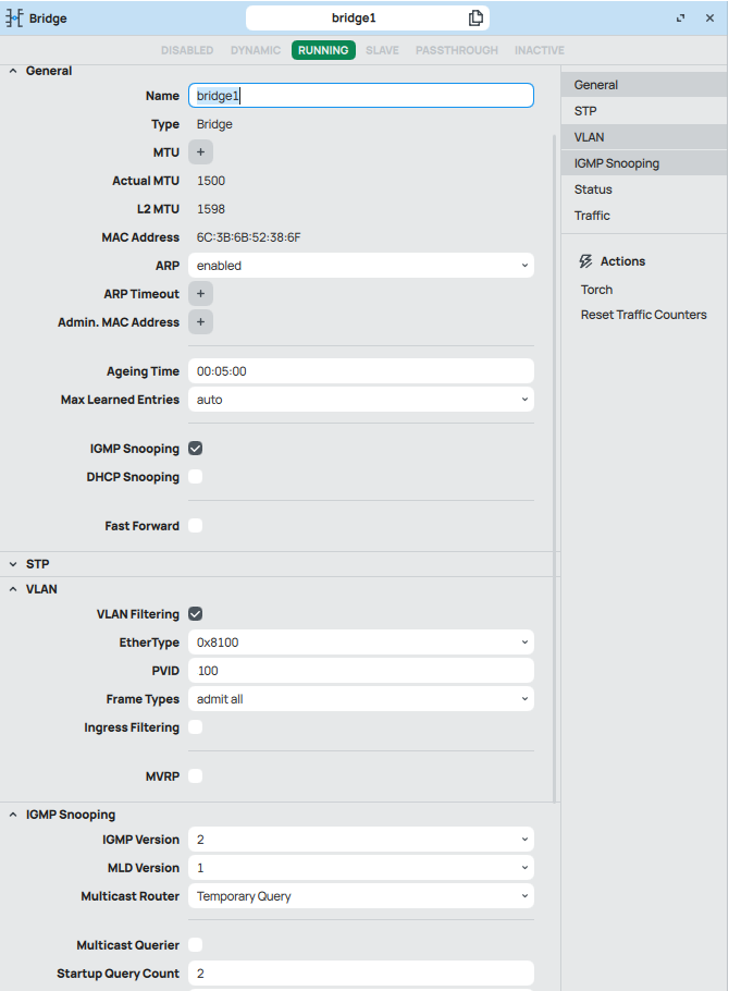 VLAN filteringactivé pour permettre la prise en compte des VLAN, - le PVID est à 100, ce qui correspond au VLAN ID de l’interface VLAN d’administration de l’équipement,