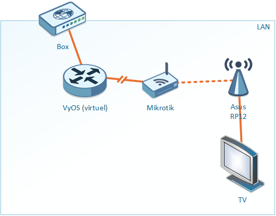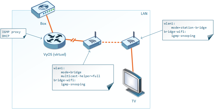 L’objectif est de faire fonctionner un décodeur TV en faisant passer les flux multicast sur un pont Wi-Fi. Dans la première partie, nous avons fait fonctionner ce décodeur en Ethernet et vérifier son comportement réseau. Désormais, rentrons dans le vif du sujet : on débranche le câble, et on essaie de passer en Wi-Fi.