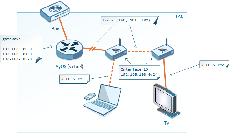 Côté routage c’est simple : le VyOS est la passerelle des 3 réseaux, et ceux-ci sont envoyés sur la fibre optique en mode trunk. En revanche la configuration des bridges sous Mikrotik n’est pas très instinctive, alors voici un résumé.