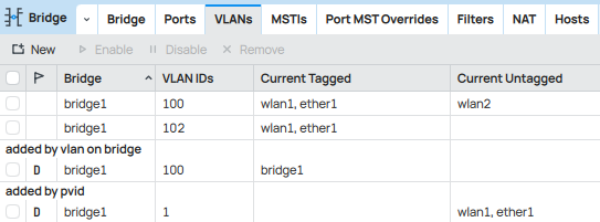 eth1et taggé sur l’interfacewlan1: on a besoin de le diffuser au 2nd Mikrotik, mais sur un lien trunk.