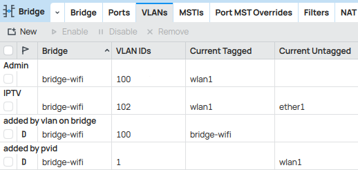 Chez Mikrotik, la fonction de commutation passe par l’utilisation de bridge. Un bridge est avant tout un groupement d’interfaces physiques. Ici c’est assez simple, les deux Mikrotik disposent d’un bridge : bridge1 d’un côté, bridge-wifi de l’autre (voir schéma plus haut). On retrouve sur le premier l’interface cuivre reliée à la fibre optique (côté VyOS et box) et les deux interfaces wlan. Sur l’autre Mikrotik, une interface wlan, connectée au réseau IPTV, et une interface cuivre qui va au décodeur.